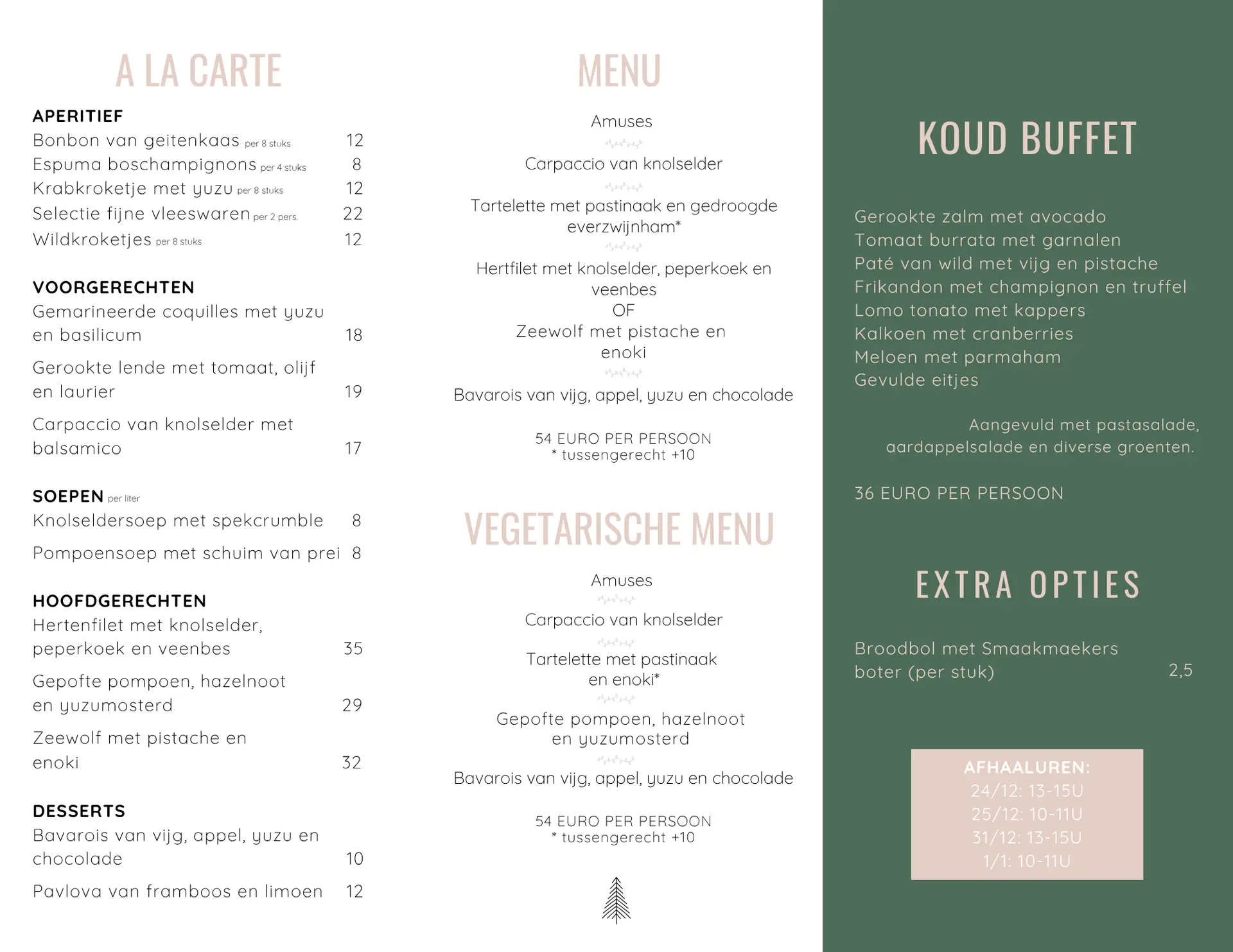 Wil je na de feestdagen thuis even écht ontspannen en niet meer omkijken naar de afwas? Op vrijdag 26 en zaterdag 27 december zwaaien we 's avonds onze deuren open. We serveren die dagen onze speciale feestmenu's, maar dan voor onze vertrouwde prijzen. Geniet van dezelfde culinaire kwaliteit, service en sfeer die je van ons gewend bent.